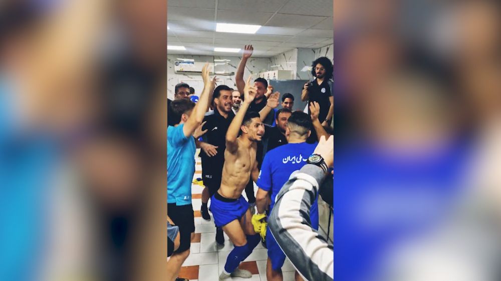 جشن و شادی بازیکنان استقلال خوزستان در رختکن بعد از پیروزی برابر مس رفسنجان